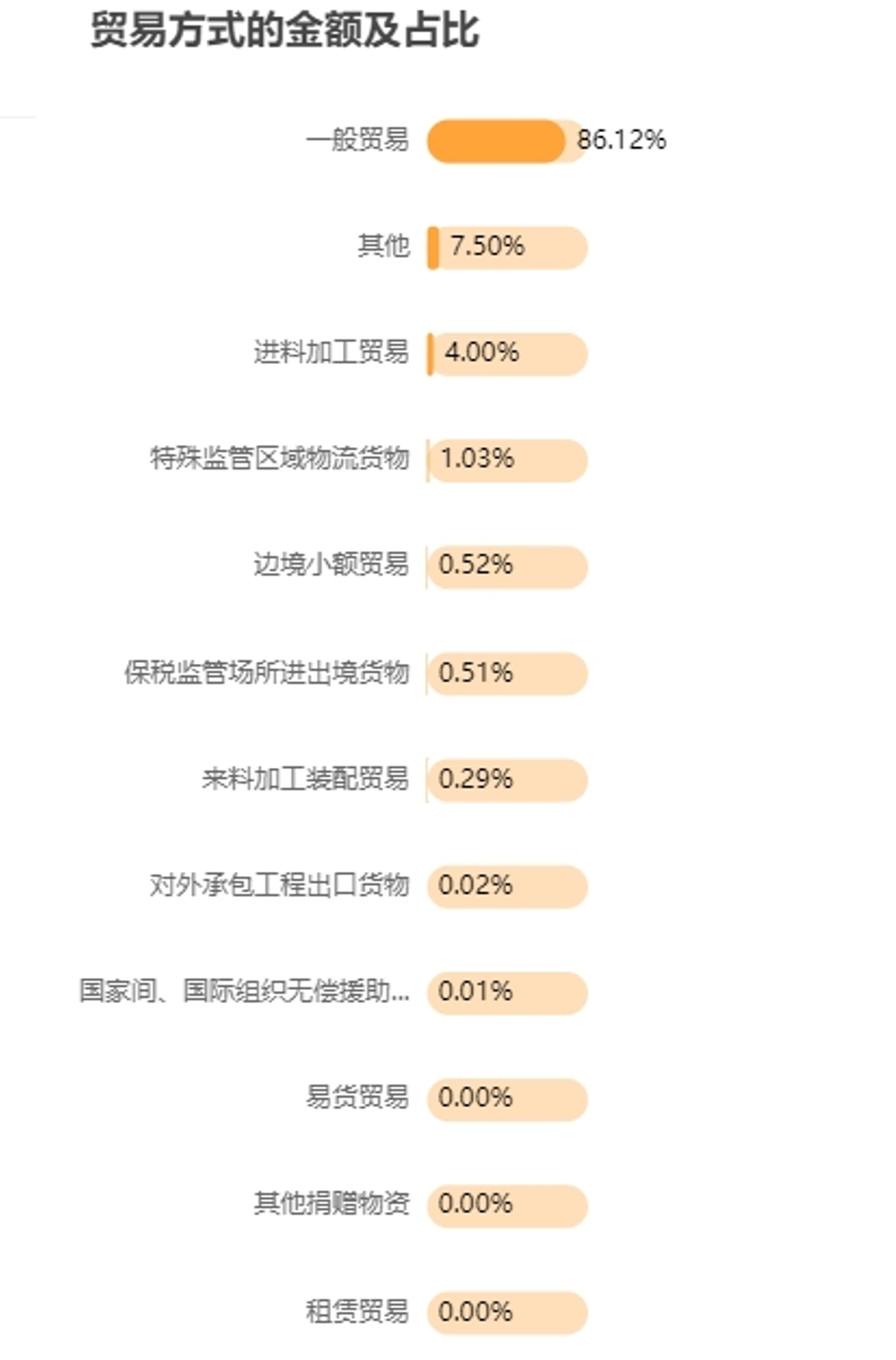 保税监管场所进出境货物方式累计进口额1.11亿美元,占比15.49%;海关特殊监管区域物流货物方式累计进口额0.61亿美元,占比8.59%;进料加工贸易方式累计进口额0.33亿美元,占比4.56%。