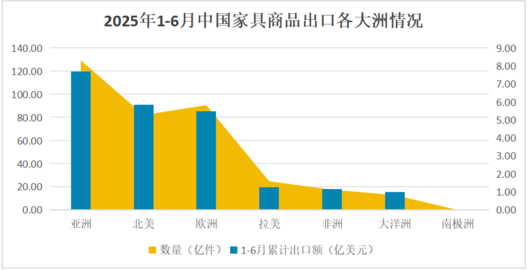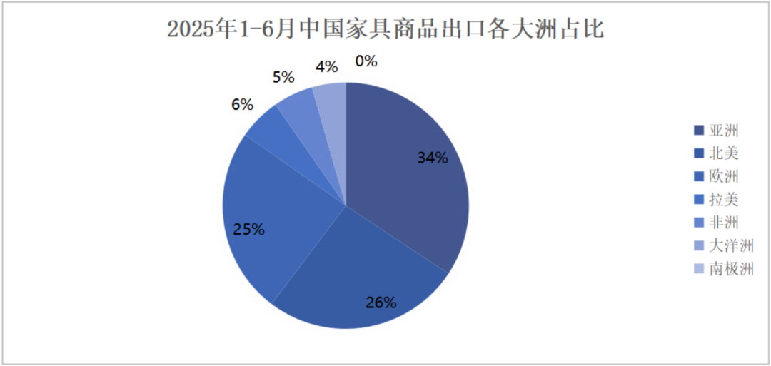 2025年1-6月,中国家具商品出口集中在亚洲、北美洲、欧洲市场,约占全部出口的84.75%。