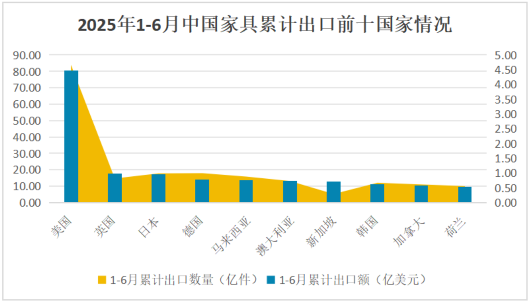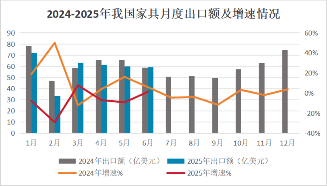 2025上半年,我国家具行业累计出口额349.15亿美元,同比下降6.72%;出口数量同比增长5.98%。