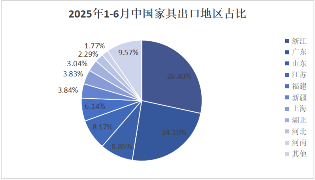 2025年1-6月,我国家具商品出口额前十的地区依次为浙江、广东、山东、江苏、福建、新疆、上海、湖北、河北、河南。