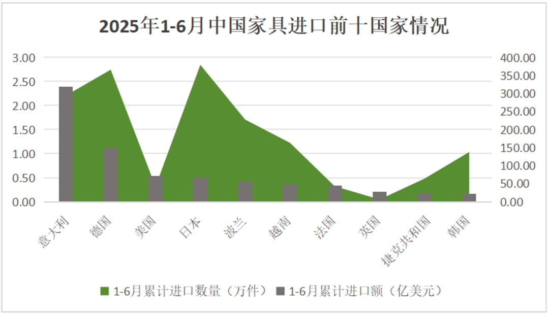 就国家来看,2025年1-6月,我国家具商品进口额居前十的来源国依次是意大利、德国、美国、日本、波兰、越南、法国、英国、捷克共和国、韩国。