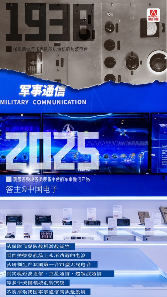 从保障飞虎队战机激战长空,到研制生产我国第一台71型无线电台,再到实现短波通信、卫星通信、超短波通信等多个关键领域突破,如今的军事通信产品谱系正傲然支撑着中国向军事强国昂首迈进。