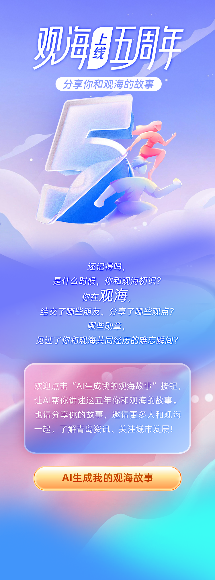 现在,只需轻轻一点“AI生成我的观海故事”按钮,AI将化身时光记录者,为你讲述这五年你与观海新闻相伴的点点滴滴。如果你是新朋友,也欢迎一键注册登录,开启与观海新闻的精彩之旅。