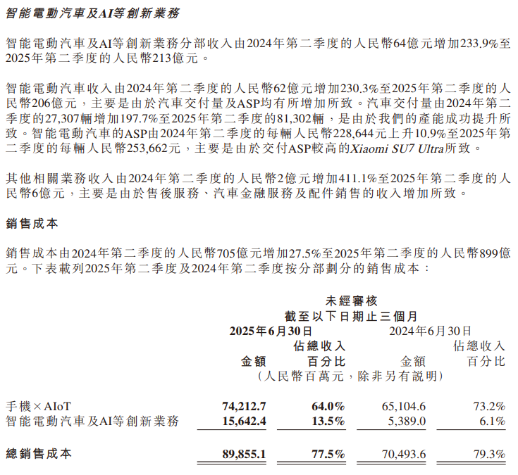 在汽车行业中,盈利一直是一个难题。当前中国造车新势力中,仅理想汽车(连续十季度盈利)与今日宣布半年度盈利的零跑汽车实现盈利。小米集团今日发布的2025年第二季度财报显示,其智能电动汽车业务以213亿元收入(含AI等创新业务)、234%同比增速成为最大亮点。其中汽车业务收入达206亿元,单季交付81,302辆创历史新高,经营亏损大幅收窄至3亿元,毛利率提升至26.4%。
