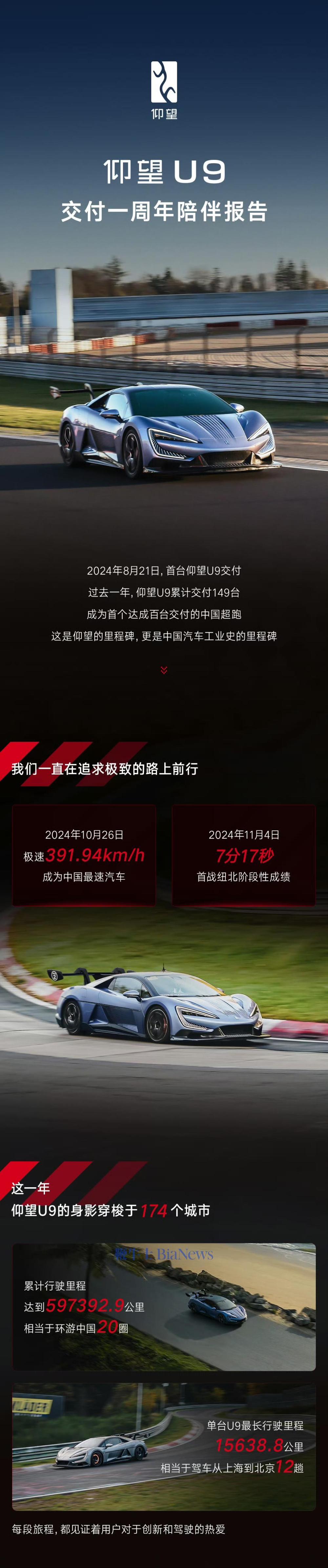 报告显示,去年8月21日首台仰望U9交付,在过去的一年里累计交付149台。