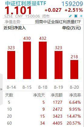 两市持续高歌猛进,中证红利质量ETF(159209)8月20日领涨两市红利类ETF,福耀玻璃、吉比特10CM涨停封板。值得注意的是,$中证红利质量ETF(159209)获资金连续8日净流入,累计约2000万,显示了资金对高质量红利指数的青睐。