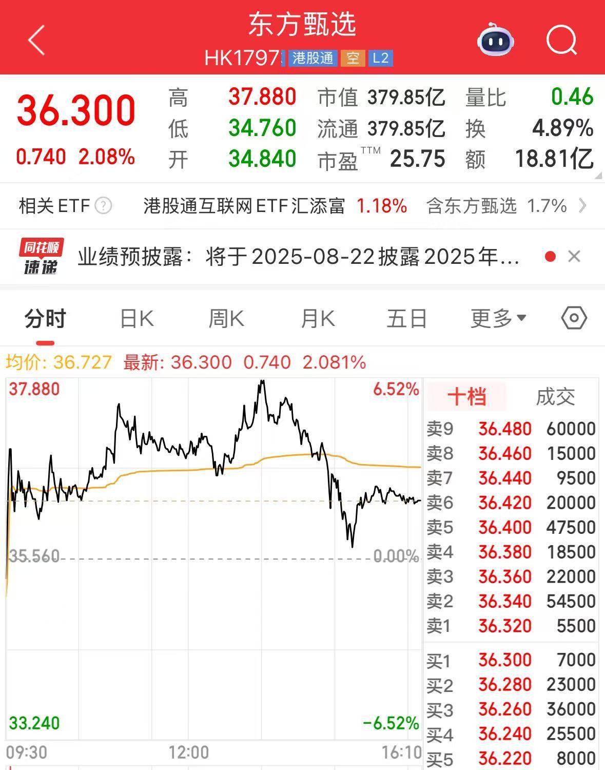 近期东方甄选股价波动较大,从11港元暴涨到50港元,随后跳水至35港元左右。截至8月22日港股收盘,东方甄选股价36.3港元,上涨2.08%,市值379.85亿港元。