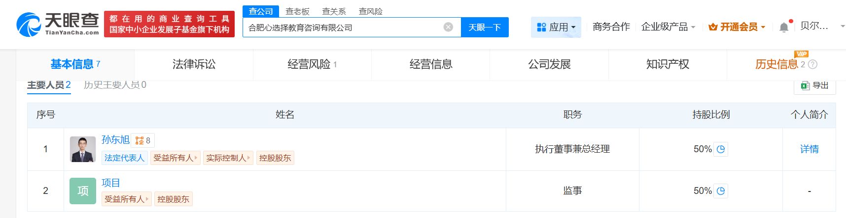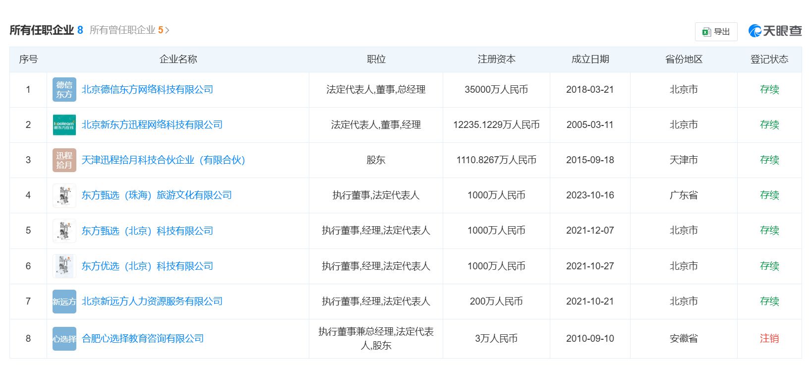 图片来源:东方甄选APP测试直播天眼查显示,孙东旭名下共关联8家企业,其中东方优选(北京)科技有限公司、东方甄选(北京)科技有限公司等7家为存续状态,孙东旭在上述企业担任执行董事、经理等职务;由其担任法定代表人和实控人的合肥心选择教育咨询有限公司目前已注销。