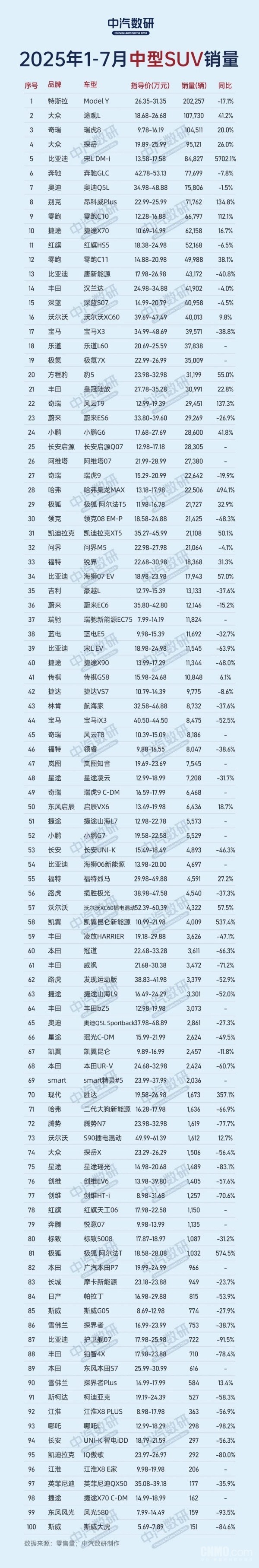 【CNMO科技消息】8月25日,根据中汽数研发布的2025年1-7月中型SUV累计销量排行榜,特斯拉Model Y以202257辆的销量稳居榜首,尽管同比下降了17.1%,但依然领跑整个细分市场。