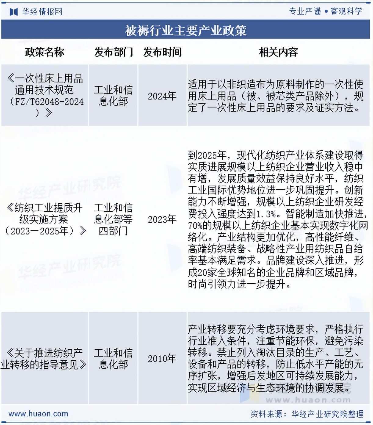 本文节选自华经产业研究院发布的《2025年中国被褥行业现状、竞争格局及发展趋势分析,环保型被褥产品市场占比有望持续扩大「图」》,如需获取全文内容,可进入华经情报网搜索查看。