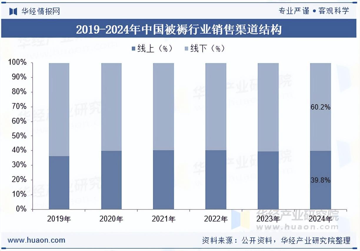 在消费市场的持续演变中,2024年,我国被褥行业在销售渠道层面,线下渠道凭借直观的消费体验,依然占据市场的主导地位,占比60.2%;而线上渠道凭借便捷性和丰富的选择,持续拓展市场份额,占比为39.8%,二者共同构建了被褥行业销售的多元格局。