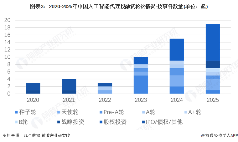 从人工智能代理的投资轮次上分析,我们可以看到股权投资占比最高。而天使或种子轮则稳定在每年4-6笔,战略投资则是在2025年开始出现了显著增加,这也反映了产业资本加速布局的情况。
