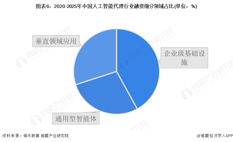 从目前人工智能代理产业的细分领域融资占比上来看,企业级基础设施占比最大,而垂直领域应用和通用型人工智能体则各占比40%左右,但通用人工智能体随着技术爆发趋势占比开始加速上升,而垂直领域应用和企业级基础设施的发展则保持稳步增长。