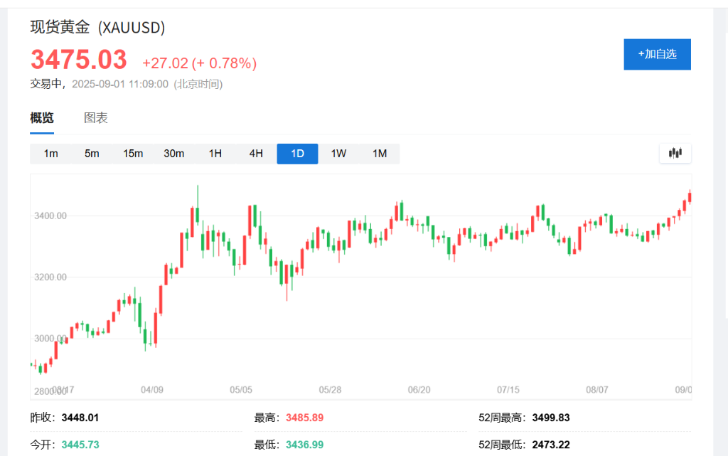 这轮涨势与黄金、铂金和钯金等其他贵金属的走势同步,黄金也于本周初创下自4月历史高点以来的新高。现货黄金日内涨幅一度超1%,报3483.63美元/盎司。