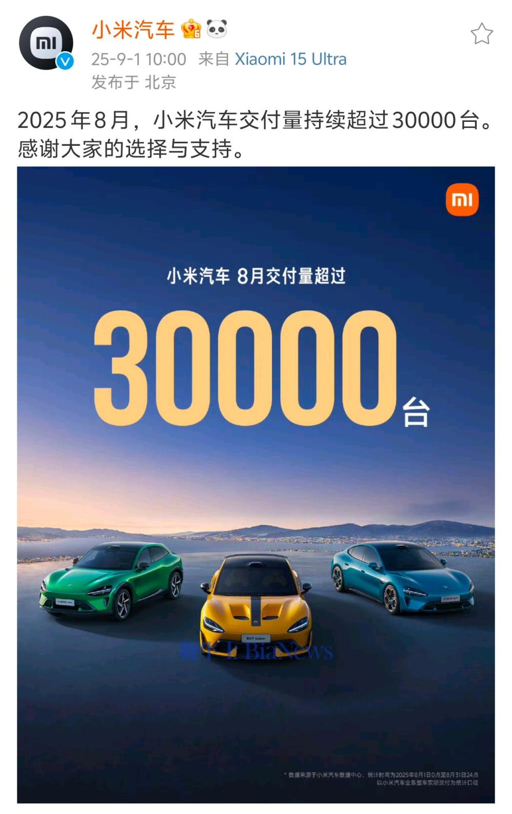9月1日,小米汽车公布最新交付数据,2025年8月,小米汽车交付量持续超过30000台。