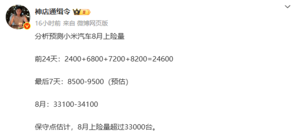 然而,有博主指出,基于更为反映实际销售情况的上述险量数据测算,小米汽车8月的市场表现可能比官方交付数据更为亮眼。根据细分数据统计,8月前24天小米汽车的上险量已达24600台(具体为2400+6800+7200+8200),而最后7天的上险量预估在8500-9500台之间。据此计算,8月总上险量预计将达到33100-34100台。即使采取保守策略估计,小米汽车8月上险量也超过了33000台。