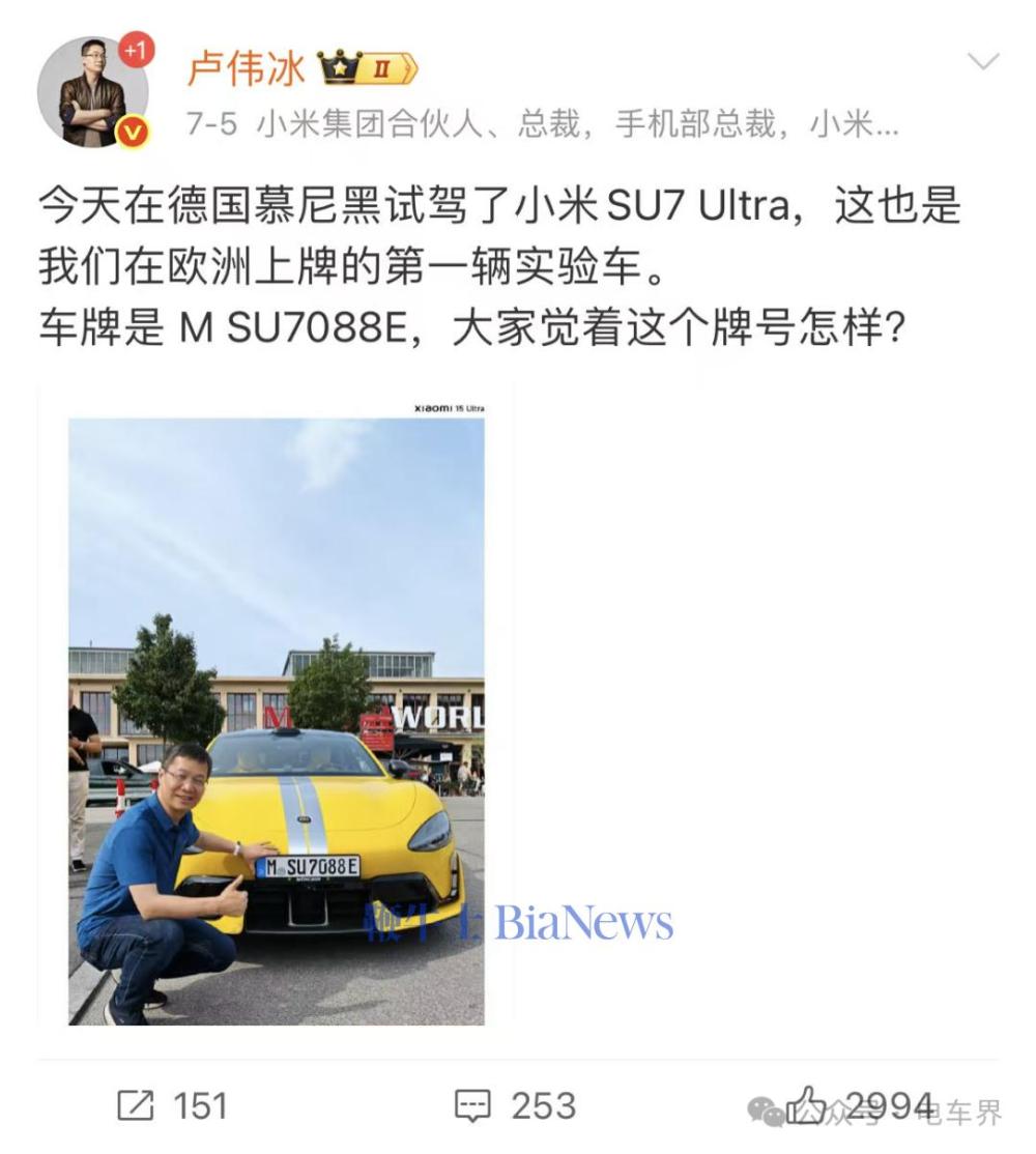 7月5日,小米集团总裁卢伟冰在微博发布了一张欧洲牌照的小米SU7 Ultra照片,并发文表示:“今天在德国慕尼黑试驾了小米SU7 Ultra,这也是我们在欧洲上牌的第一辆实验车。”