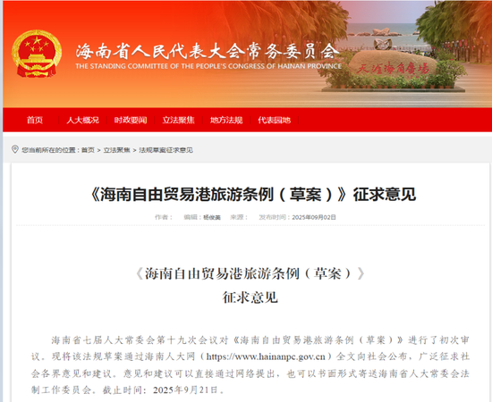 中国证券报记者9月5日从海南省人大常委会获悉,《海南自由贸易港旅游条例(草案)》近日公开征求意见。
