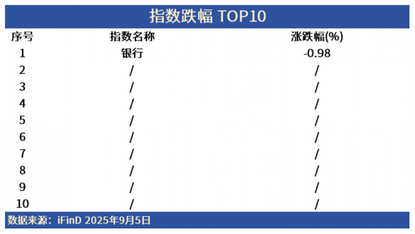 截至2025年9月5日收盘,仅银行小幅回调-0.98%,邮储银行、农业银行跌幅居前。