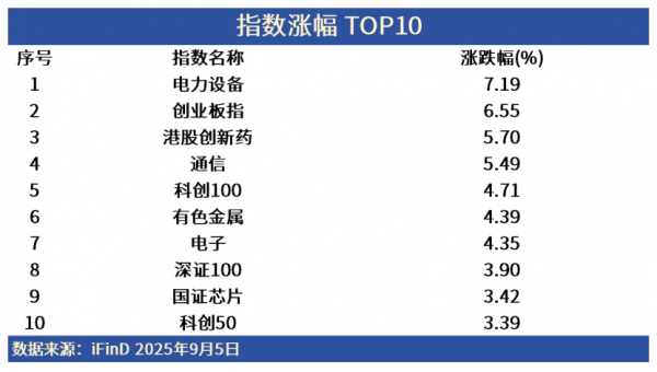 iFinD数据显示,截至2025年9月5日A股收盘,电力设备、港股创新药、通信领涨,涨幅分别达7.19%、5.70%、5.49%。