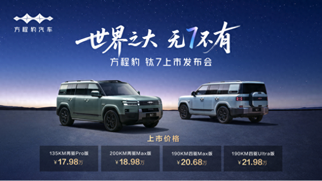 发布会现场,新车共推出4个配置版本,售价17.98万元至21.98万元。其中,135KM两驱Pro版17.98万元,200KM两驱Max版18.98万元,190KM四驱Max版20.68万元,190KM四驱Ultra版21.98万元。下单还可以享受最高价值超3.6万元的上市权益。