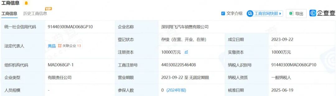 深圳翔飞成立于2023年9月,实缴资本1亿元,两大股东为深圳卓凯和深圳凤宇。这两家公司,也是深圳悠宝利新能源汽车的股东。