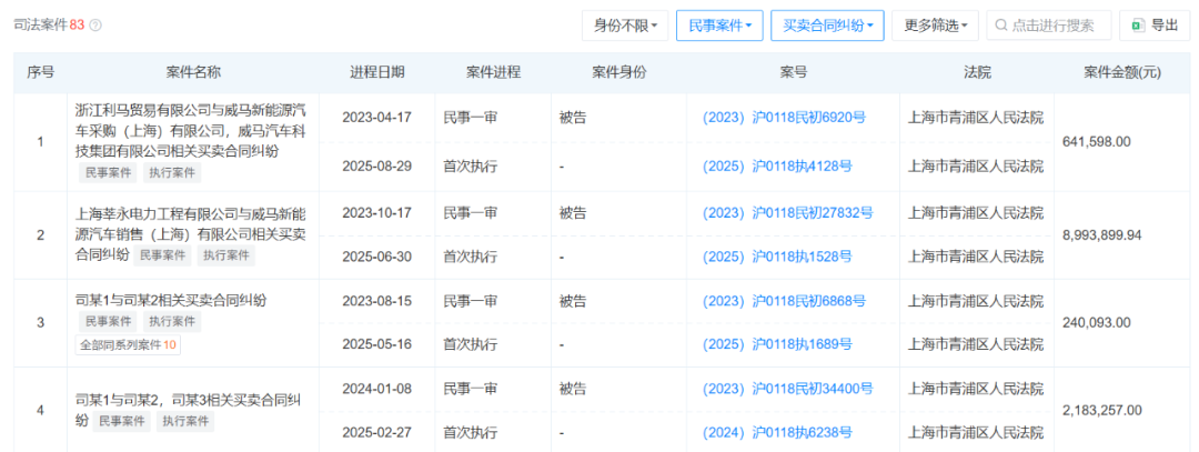 天眼查显示,威马汽车科技有83起买卖纠纷,单拖欠伟巴斯特车顶供暖系统的款项,就高达421万元。