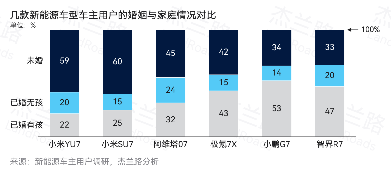 对比杰兰路此前对极氪7X、小鹏G7、阿维塔07与智界R7等SUV用户的画像研究,可以明显看出,小米汽车车主在人群结构上更为年轻,人生阶段更早,大部分车主仍处于单身或二人世界阶段,其中小米YU7只有22%的用户是已婚有孩,小米SU7这个数值是25%,而阿维塔07为32%,极氪7X为43%,智界R7为47%,小鹏G7更是超50%。