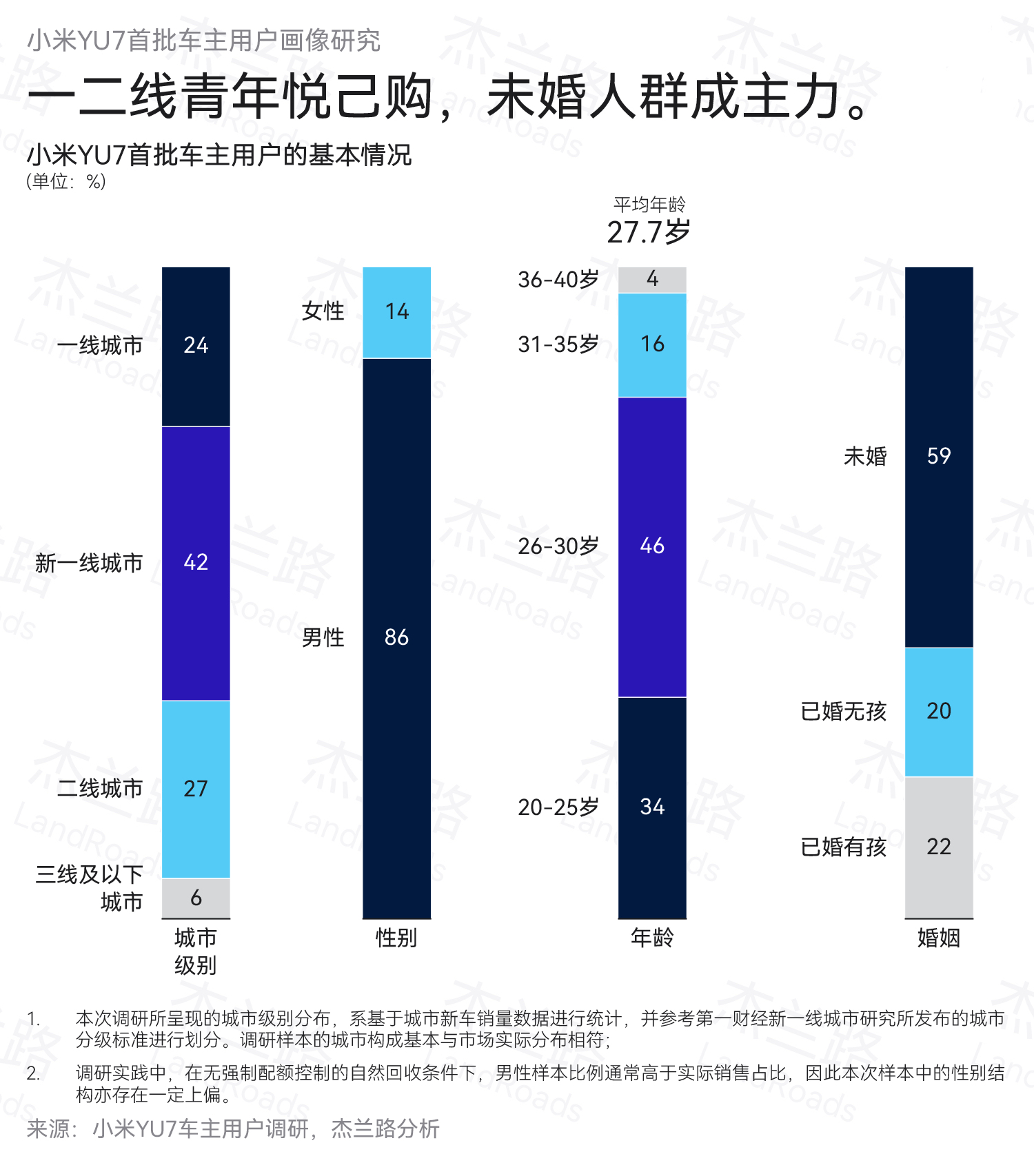 小米YU7用户在人群结构上较为年轻,平均年龄仅为27.7岁,近八成集中在20至30岁之间,且多数来自一二线城市,86%的车主为男性。此外,未婚用户比例达到近六成。