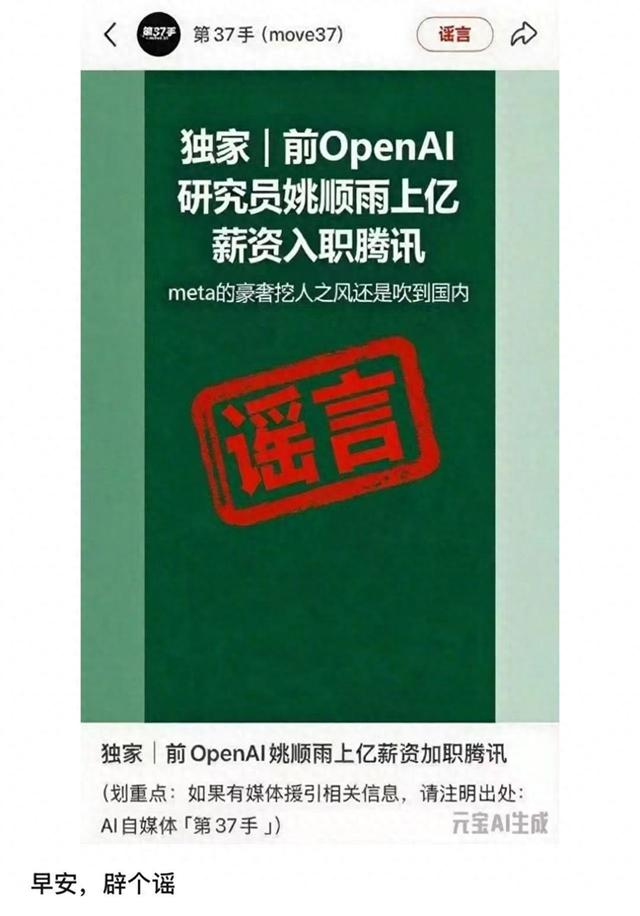 【环球网科技综合报道】9月12日消息,腾讯官方公众号“鹅厂黑板报”今日发布辟谣信息,针对“前OpenAI研究员姚顺雨以‘上亿薪资’入职腾讯”的报道进行澄清,明确指出该消息为谣言。