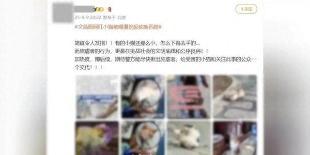 近日,“贵州文昌阁多只小猫被挖眼砍断四肢”等话题登上微博热搜,相关内容为:有网友发布视频称,在贵州贵阳文昌阁附近,发生多起虐待或虐杀小猫事件。话题发布后,迅速引起网友广泛关注。