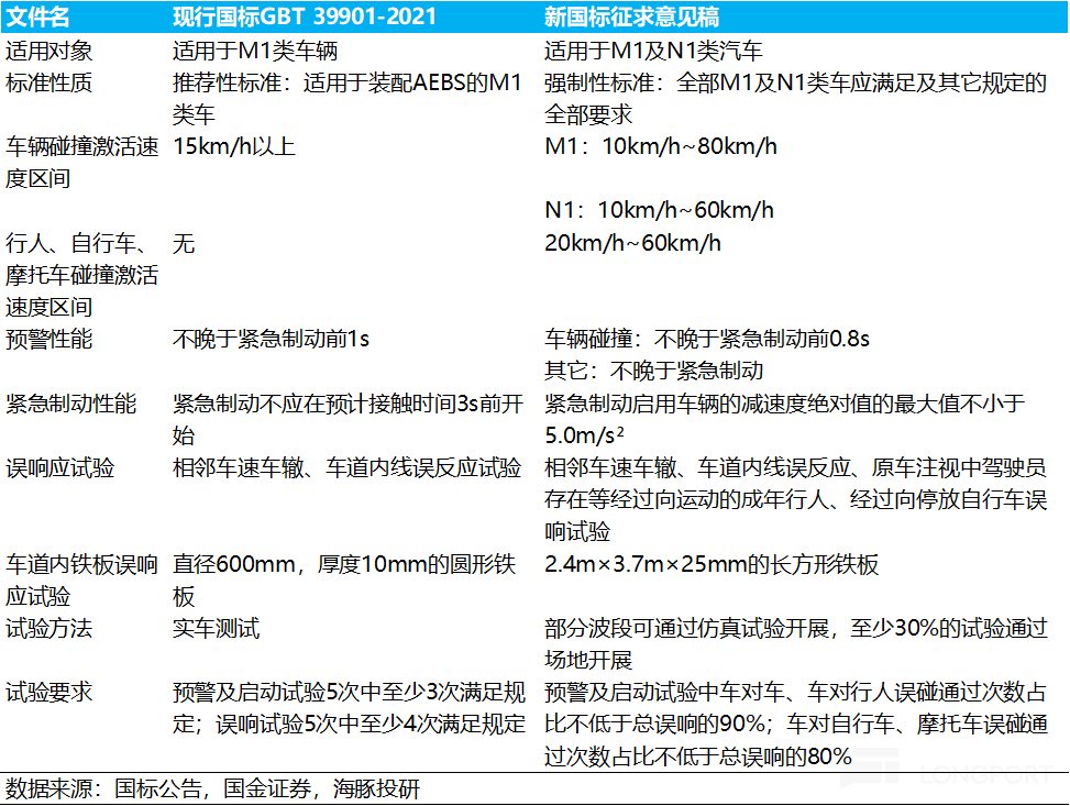 2)AEB激活速度区间提升:M1/N1 类汽车AEBS 系统激活速度区间由 15km/h 以上分别改为 10-80km/h和10-60km/h,同时明确对行人和两轮车有效识别的激活速度区间为 20km/h-60km/h;