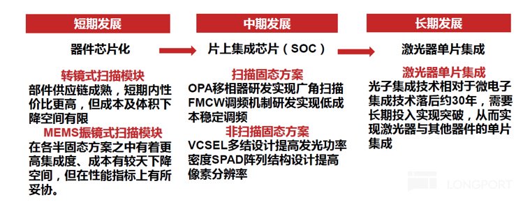 固态激光雷达具备结构最简单,集成度最高,体积最小和成本更低的优势,但短期受制于技术成熟度不高,发射功率和探测距离都比较低,所以一般作为补盲雷达使用,但中期激光雷达的突破方向仍可能向着固态激光雷达方向迭代,技术栈仍未呈现收敛状态。