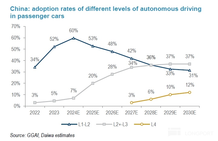 而海豚君预计,在电动化创新已接近尾声,车企围绕智能化的竞争趋势只会日益激烈,参考手机行业从“功能机”向“智能机”的迭代大趋势仍然不改,从电动车到智能汽车的转变是未来5-10年产业性机会,而海豚君预计2026年L2级的ADAS普及仍将会由比亚迪、吉利长城、长安等大众车企所推动。