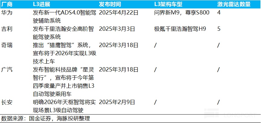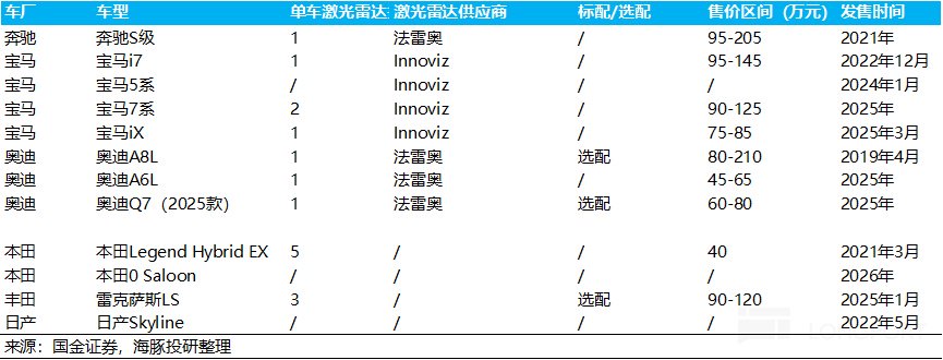 数据来源:国金证券b. L3自动驾驶由于事故责任转移给车企,车企搭载激光雷达作为“安全冗余”动力更足