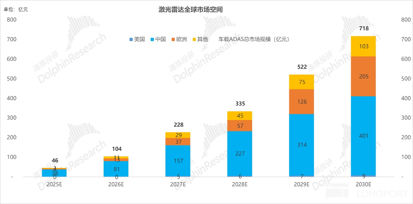 而由于海外市场本质上无真正意义的竞争对手(性能低成本高),海豚君假设欧洲市场平均每车激光雷达价值量是中国的3倍,其他市场是中国市场的1.5倍,美国市场因政策敏感性因素,处于谨慎性原则暂不纳入考虑