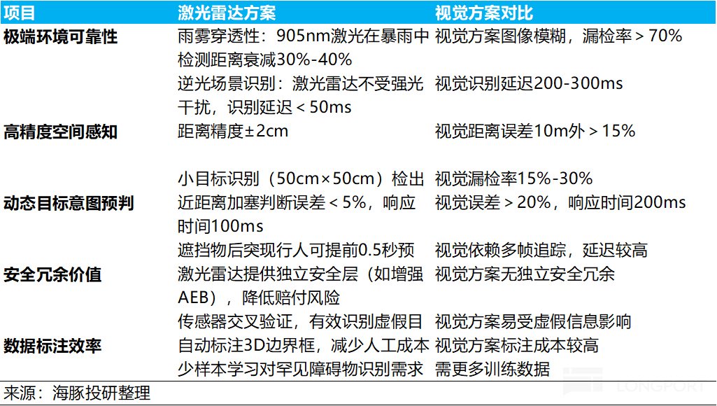 而激光雷达除了承担“智驾之眼”作用外,另重更重要的作用是在智驾技术尚未走入成熟期时担当“安全冗余”,尤其是作为相比纯视觉方案解决corner case的更优解(强弱光、雨雾等环境),显著降低事故发生率和赔付成本,反而对于车企来说是更具性价比方案。