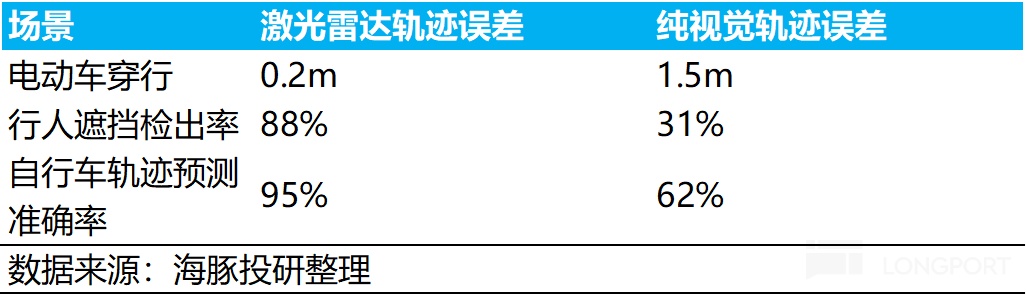 面对城区复杂路况(行人+自行车+电动车混合穿行)情况下:对轨迹预测的准确率和遮挡目标的检出率都高于纯视觉方案,核心原理是由于激光雷达的数据是直接测量的3D点云数据,而纯视觉方案将2D图像通过BEV转换成3D方案,面对遮挡场景容易失效,视觉方案的“概率猜测”本质决定误检率会更高。