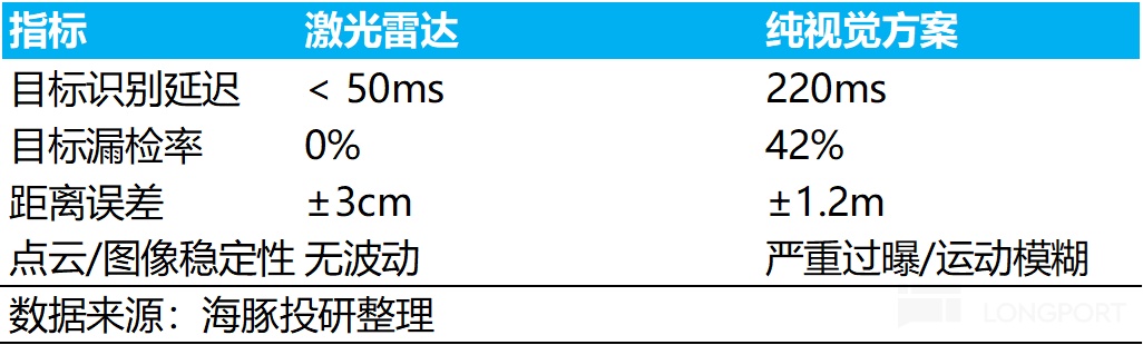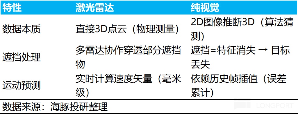 激光雷达通过实时点云追踪(10Hz刷新)精准计算加塞车辆相对速度+加速度,而纯视觉依赖图像特征点匹配,帧间匹配误差导致延迟提升。