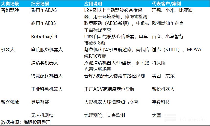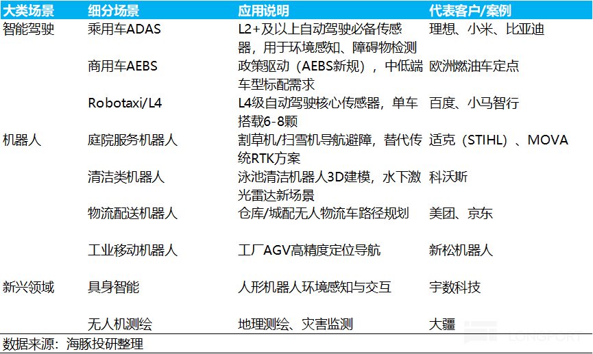 激光雷达与芯片行业一样,都具备强场景扩展性,而目前激光雷达出货场景主要集中在L2乘用车和L4 Robotaxi上,虽然机器人场景目前出货仍以割草机为主,但在场景扩展上仍具备大规模应用的解锁潜力。
