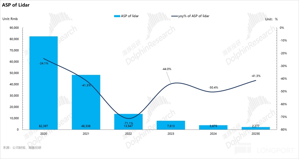从禾赛的激光雷达价格来看,激光雷达价格一直呈现快速下沉趋势,从2020年-2024年,激光雷达的平均价格(blended ASP)从8.2万元降低至2024年仅3900元左右,5年平均价格降幅达-51%,而在2025年乘用车集中出货的ATX,价格仅有200美元不到,这个价格已经相当于激光雷达进入了类似智能手机的“千元机”时代,更符合乘用车高价格敏感性场景的大规模拓展。