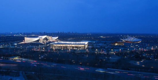北京艺术中心、北京城市图书馆和北京大运河博物馆夜景(从左至右,2024年2月28日摄)。新华社发