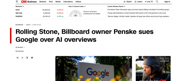 【环球网科技综合报道】9月15日消息,据CNN报道,《滚石》杂志母公司彭斯克媒体集团(Penske Media Corporation)近日正式对谷歌提起诉讼,指控谷歌搜索结果顶部的AI摘要功能(AI Overviews)不仅减少用户对媒体原文的点击量、侵蚀网站流量,还涉嫌非法利用记者创作成果。此举使该集团成为美国首家就谷歌AI摘要功能提起诉讼的大型媒体机构。