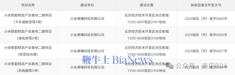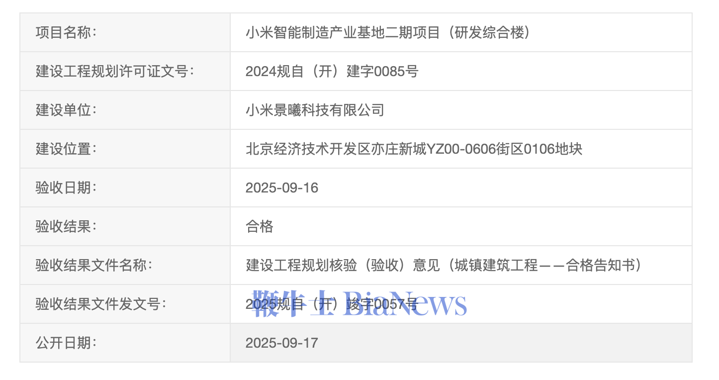 9月17日,“亦庄 BDA”公众号发文称,小米汽车二期研发综合楼、卡车调度室、油化库等规划验收通过。