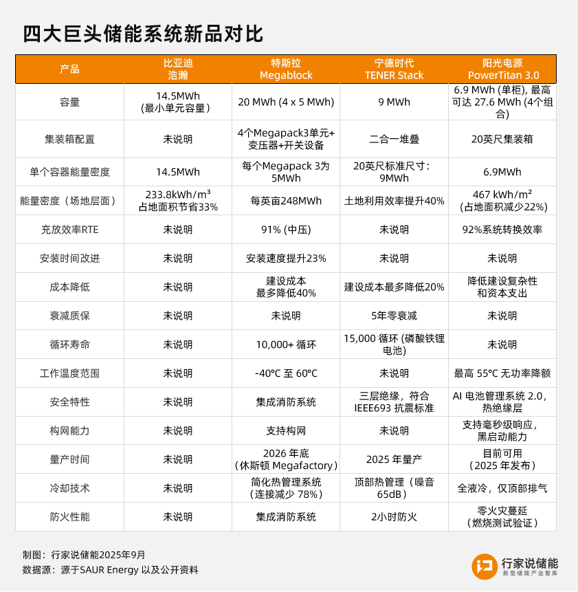 除了比亚迪储能外,今年以来,宁德时代、阳光电源、特斯拉也相继推出新一代大容量储能系统解决方案。这一动向不仅表明了当前大储市场的竞争强度,也凸显出巨头们正积极争夺下一代储能系统的话语权与定义主导权。