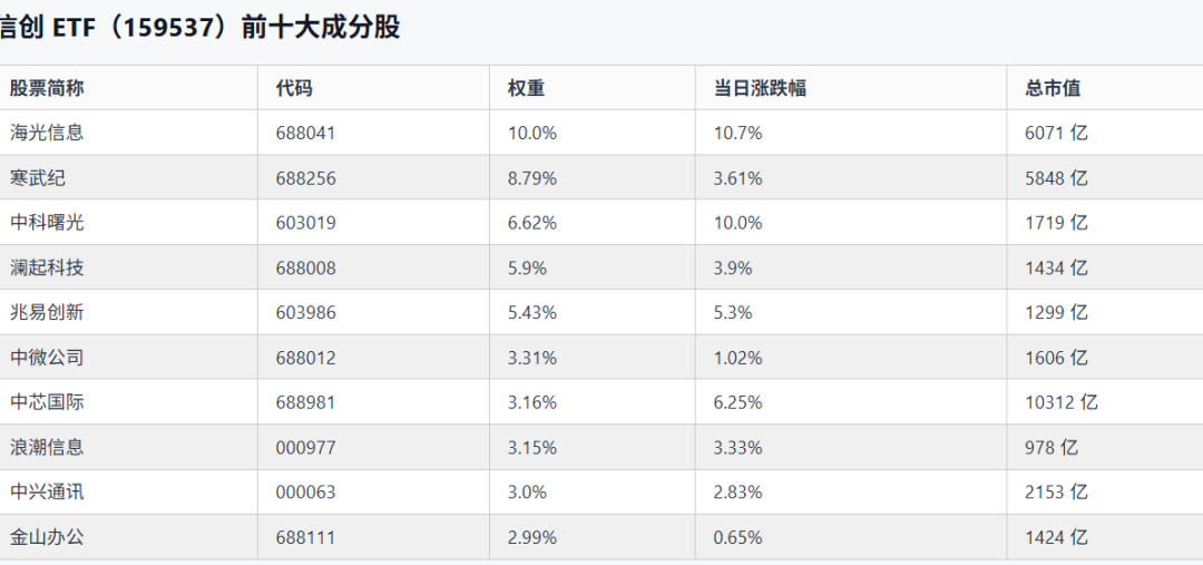 ETF 十大重仓个股中,海光信息和中科曙光表现尤为突出,当日涨幅分别达 10.70%和 10.00%,寒武纪、兆易创新和中芯国际涨幅也较为显著,分别为 3.61%、 5.30%和 6.25%。