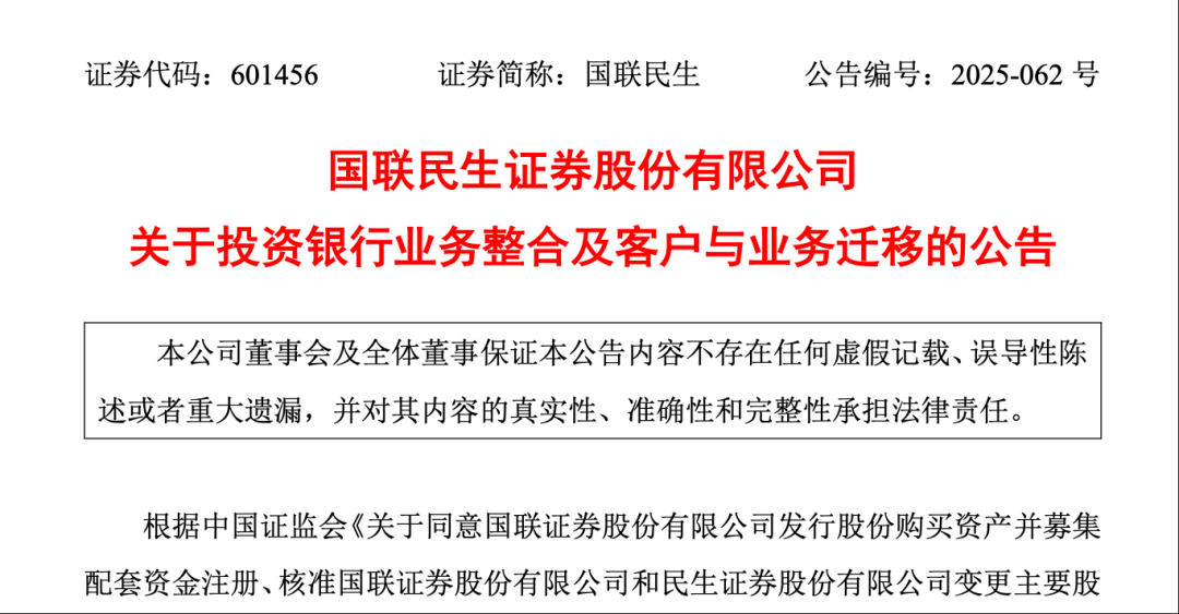 公告显示,自2025年9月23日起,民生证券现有上海证券交易所、深圳证券交易所、北京证券交易所、全国中小企业股份转让系统的股权类在审、已注册尚未完成发行、已获同意未完成挂牌、持续督导项目清单中项目,以及所有其他在辅导、债券承销、受托管理以及财务顾问等项目,将迁移并入国联民生承销保荐。