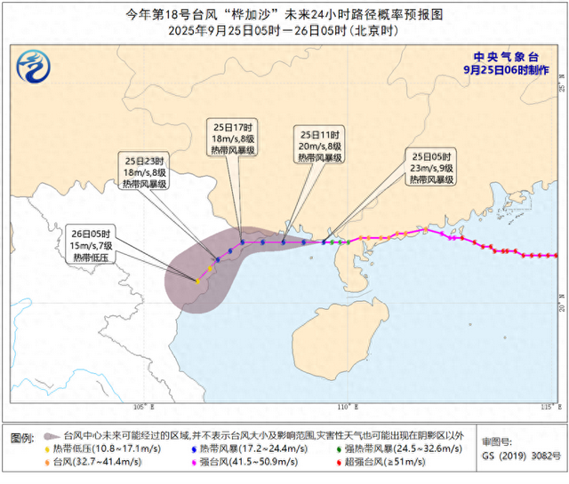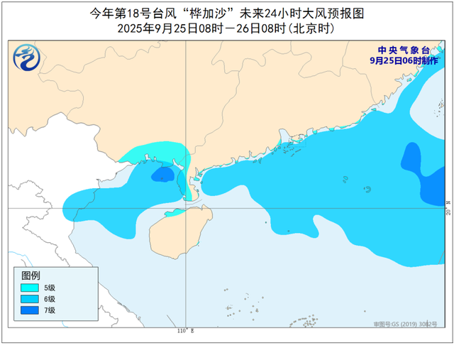 大风预报:25日8时至26日8时,南海北部、北部湾、广东沿海及西南部地区、珠江口区、广西沿海将有6至7级、阵风8至9级的大风,台风中心经过的附近海域或地区风力可达8级、阵风9至10级。