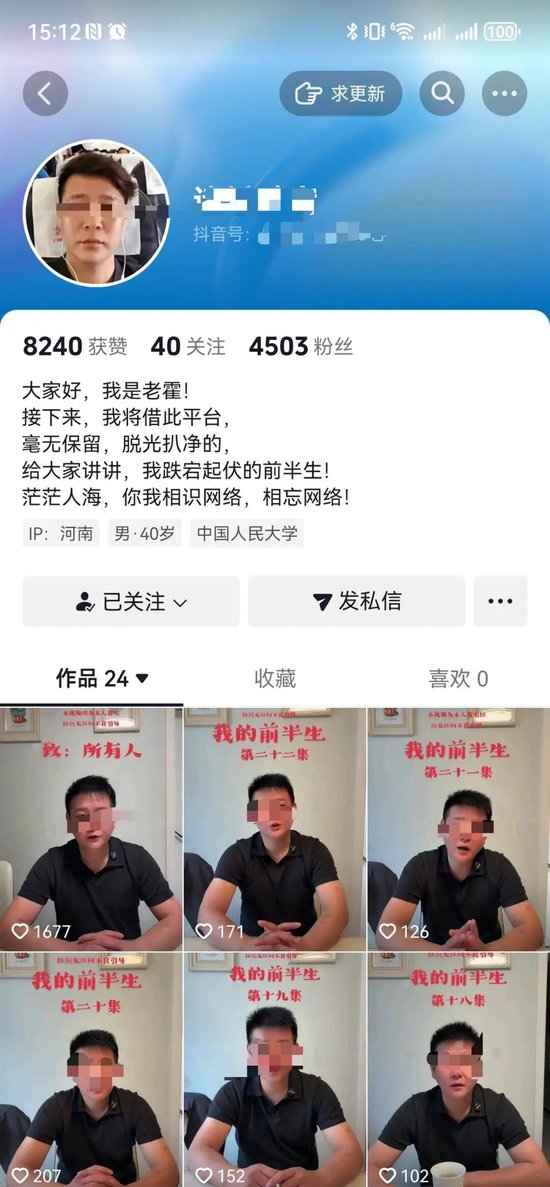 除了道歉的视频,该账号从9月20日至23日共发布24个视频,霍某分段讲述了自己的“前半生”。
