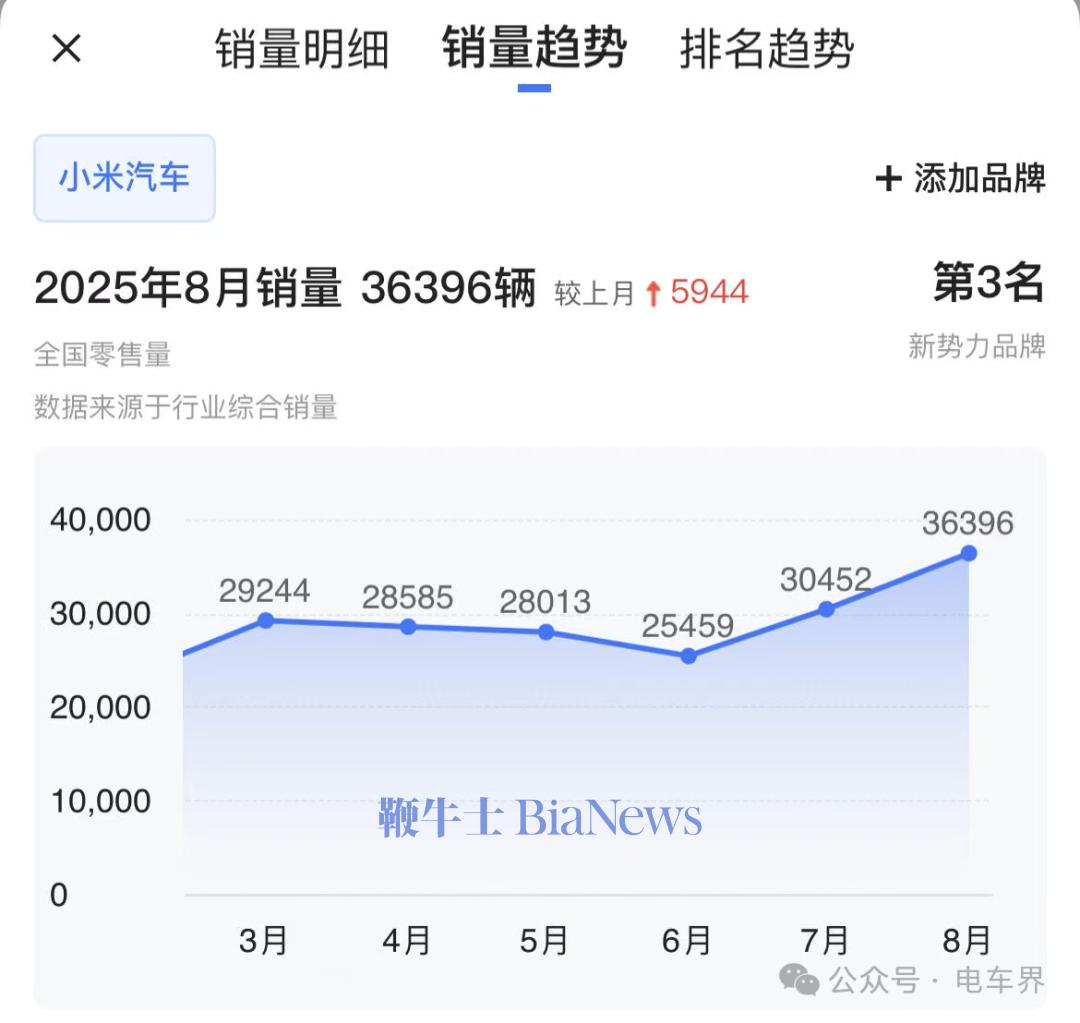 有很长一段时间,小米汽车的月交付量一直维持在2万多辆。但从今年7月开始,其月交付量上升到了3万辆;8月更是再度涨到3.6万辆。